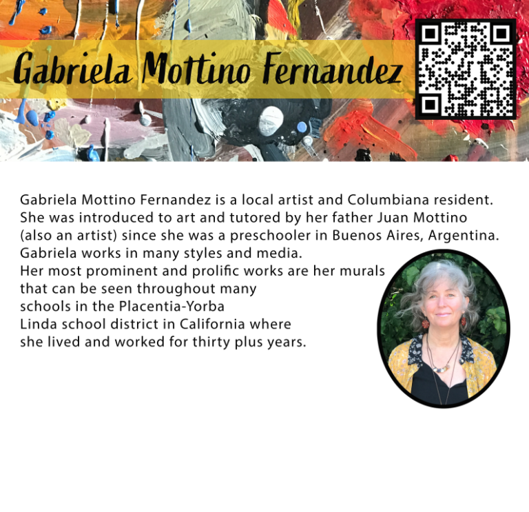 Gabriela Mottino Fernadez is a local artist and Columbiana resident. She was introduced to art and tutored by her father, Juan Mottino (also an artist) since she was a preschooler in Buenos Aires, Argentina. Gabriela works in many styles and media. Her most prominent and prolific works are her murals that can be seen trhoughout many schools in teh Placentia-Yorba LInda School District in California, where she lived and worked for thirty plus years.